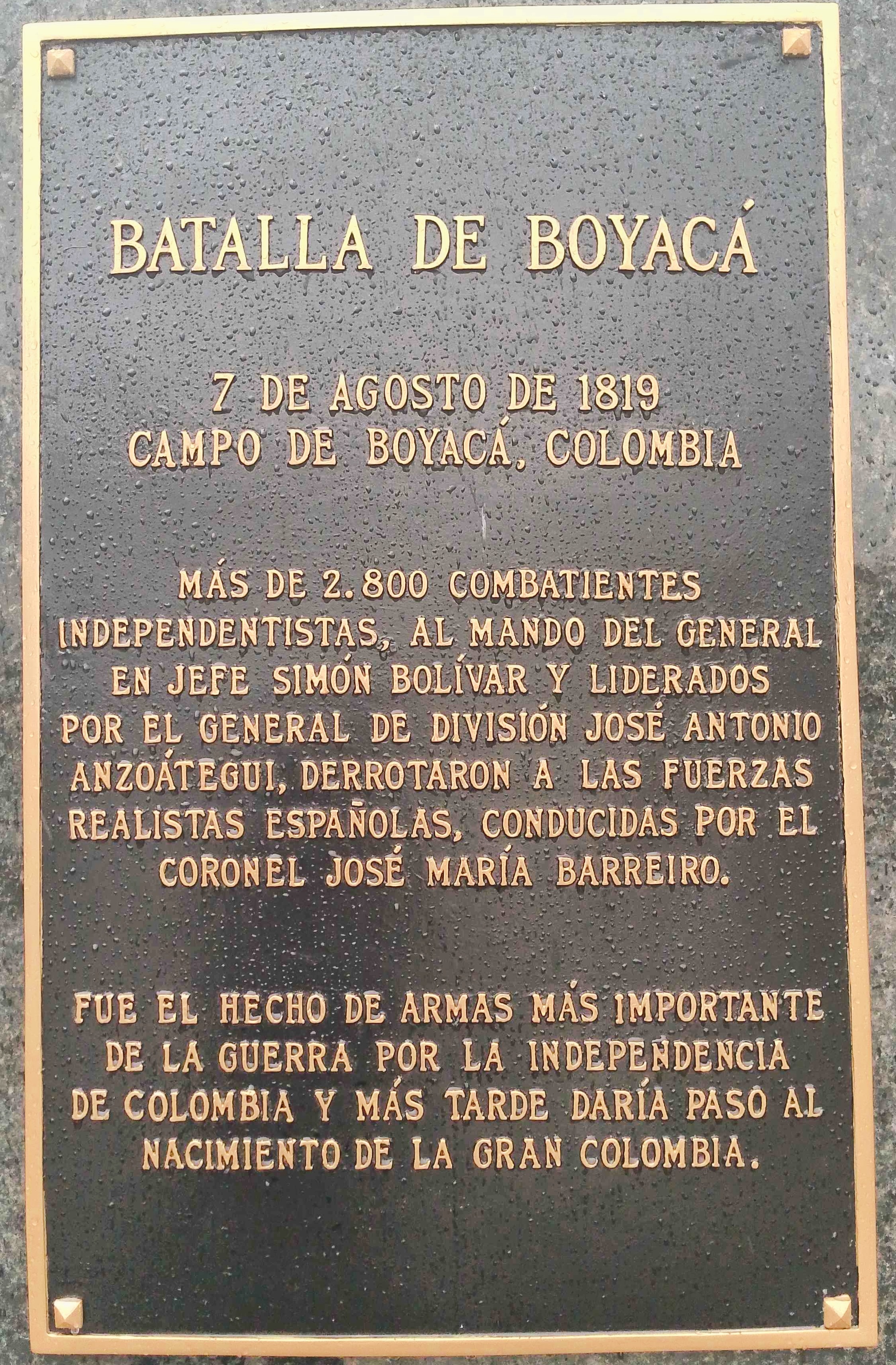 El 7 de agosto de 1819 se produjo la batalla de Boyacá en Colombia, fueron 2800 combatientes independentistas liderados por los venezolanos Simón Bolívar y José Anzoátegui, quienes se enfrentaron a las fuerzas armadas realistas españolas lideradas por José Barreido. Esta fue la batalla más importante en la guerra de independencia de Colombia, esta victoria dio paso al nacimiento de la Gran Colombia.